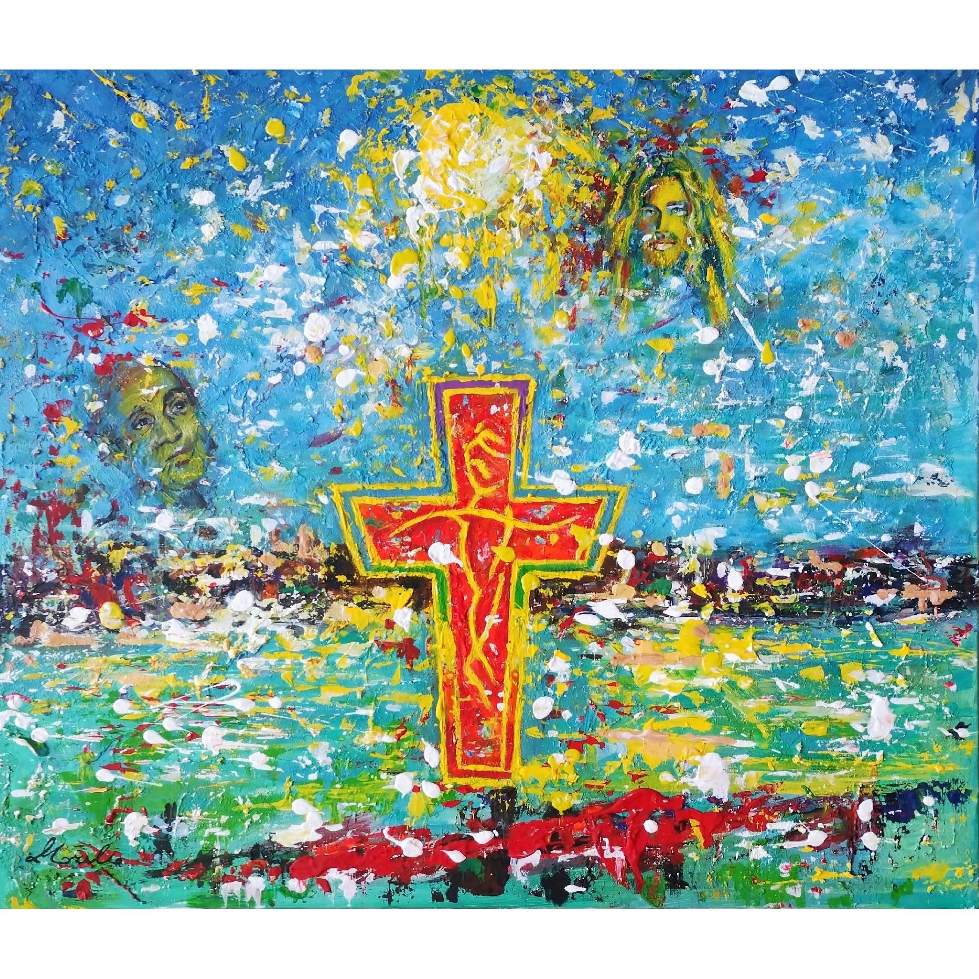In uno spazio sospeso tra cielo e mare, forme e volti affiorano come presenze silenziose. La luce non illumina, ma custodisce; la croce non divide, ma tiene insieme. È un’opera sulla veglia, sulla testimonianza discreta e su quella pace inquieta che non si impone, ma protegge.